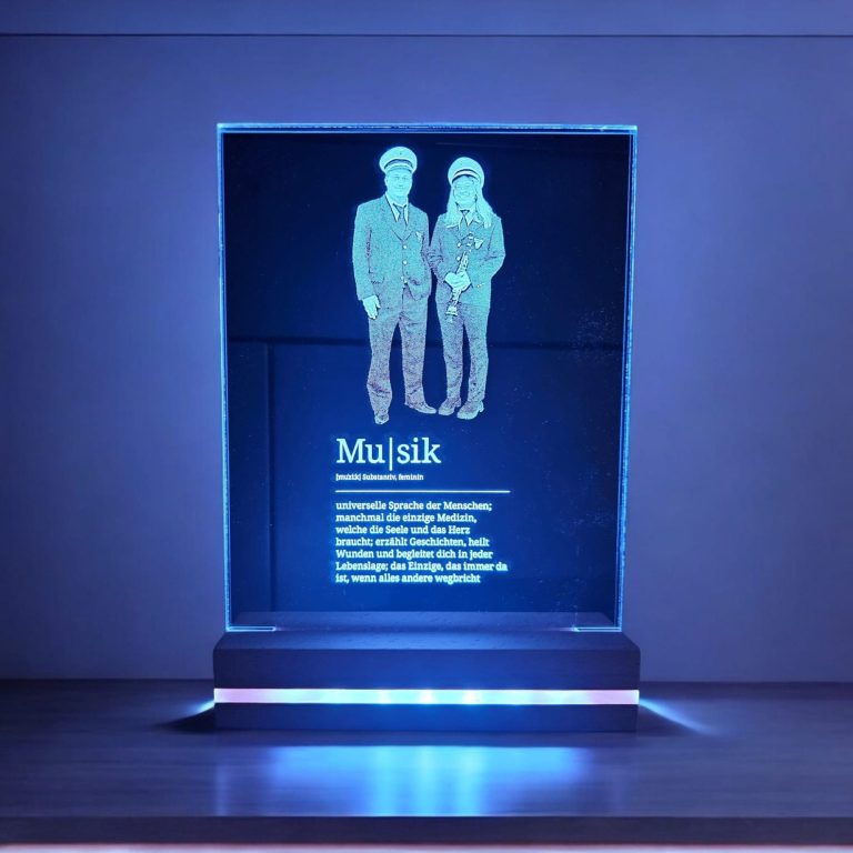 Egal ob als Geschenk oder für sich selbst, unsere Acrylglasaufsteller mit beleuchtetem Sockel sind graviert ein echter Hingucker.